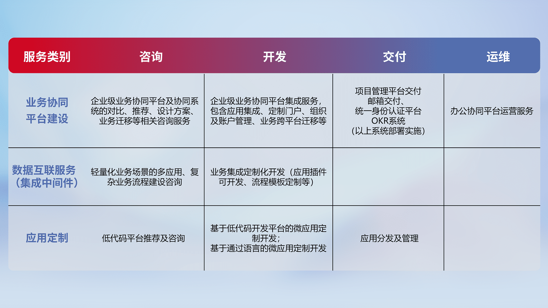 针对钉钉、、、、企微、、IDaas等平台级产品提供产品的规划、、方案、、、、交付、、、、定制化开发等服务,,,,实现如统一协同办公、、智能客户服务、、、、混合会议管理、、、、智能数据查询、、等业务场景,,,实现数字化转型。。。