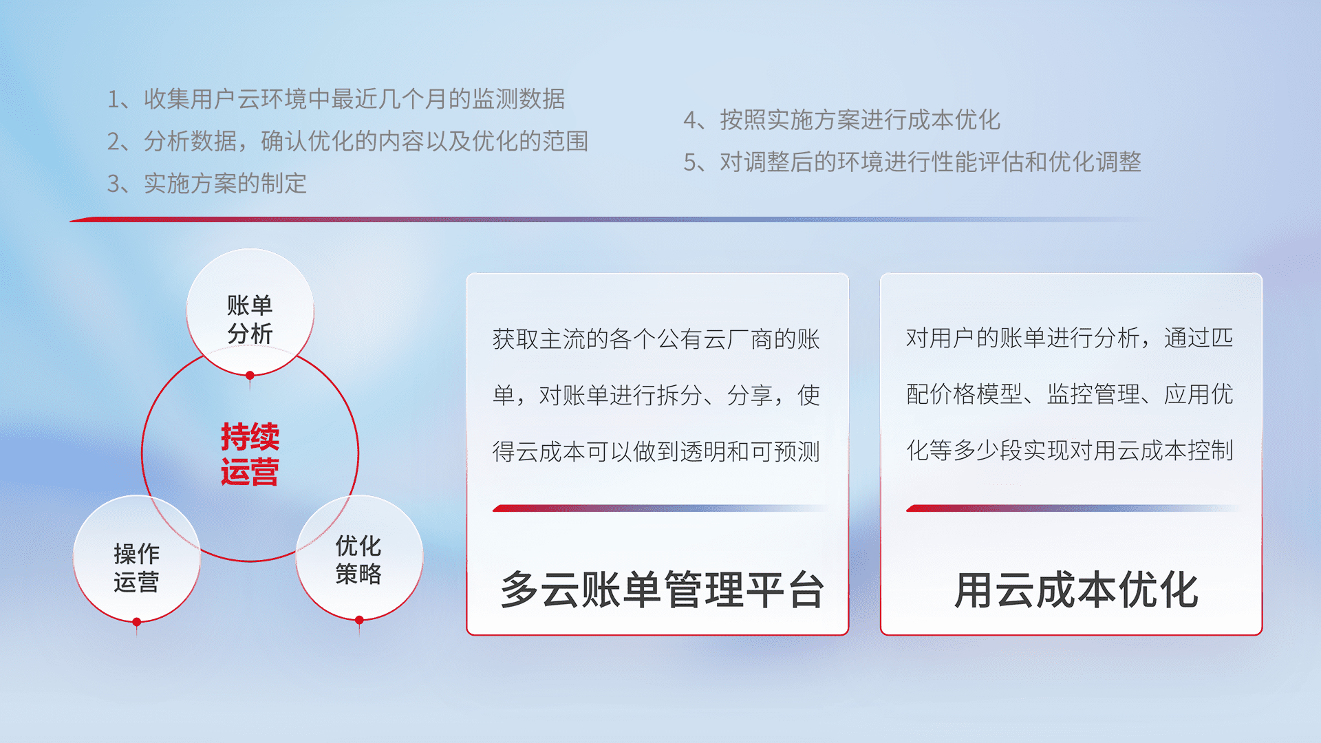 通过多云纳管,,以统一的资源数据模型把客户的云资源进行抽象和封装,,,,进而实现对多云资源的统一操作,,,,保障云资源管理的可靠性、、、稳定性与可用性。。。量身定制化运维内容,,,配置、、、开发运维、、、、补丁管理、、备份、、、监控、、、认证和访问管理、、审计和日常巡检等,,保障在用云过程中的可靠度,,,稳定度以及高可用率。。